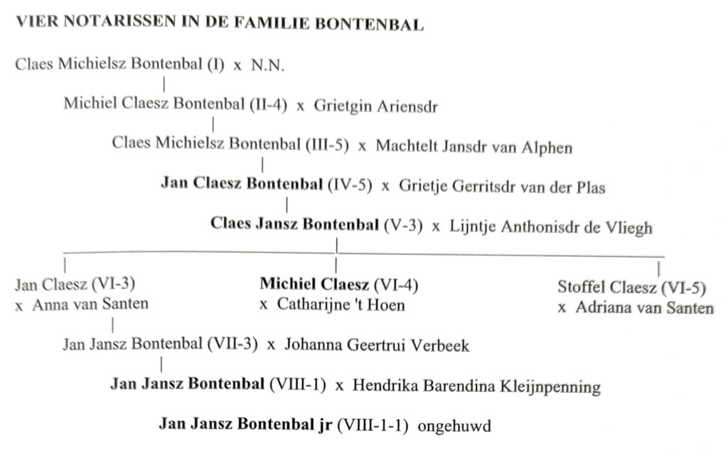 De derde Bontenbal die notaris werd, was Claes’ tweede zoon Michiel Bontenbal (V1I-4). Hij werd op 25 april 1692, op recommandatie van Jacobus Kruger ambachtsheer van Berkel en Rodenrijs, geadmitteerd tot notaris aldaar en werkt er tot 1698 (protocol, inv. nr. 774). Ook hij mag zich later vestigen in Zevenhuizen en van 1697/98 tot zijn dood in 1719, dus zo’n twintig jaar, werkt hij in die plaats als notaris (protocollen, inv. nrs. 8929, 8930 en 8931).