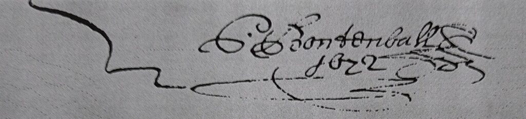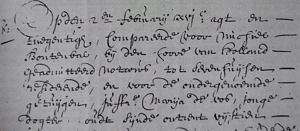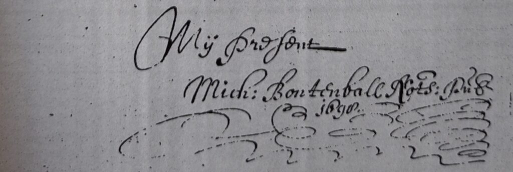 In bovenstaande figuur zijn details afgebeeld uit een van de vele aktes die Michiel Bontenbal in 1698 opstelde en schreef. Op de tweede en de derde regel van de akte staat zijn naam Michiel Bontenbal en aan het einde ervan heeft hij zijn handtekening “Mich. Bontenball” gezet. Het is opmerkelijk dat hij zijn naam in de tekst met één 1 heeft geschreven maar daarentegen zijn handtekening met twee letters 1. De reden van dit verschil ís onduidelijk. Is hier misschien sprake van een nu onbekende taalregel, een taalregel die nu nog terug te vinden ís in de Duitse en de Engelse taal. In deze talen worden veel namen die op een l eindigen met twee letters l geschreven, zoals bijvoorbeeld de Duitse naam Schnell en de Engelse naam Churchill. Wat de reden ook was, het gebruik van twee letters 1 in de handtekening was in overeenstemming met hetgeen zijn vader deed (zie hiervoor). Zijn handtekeningen waren ook vaak op deze manier geschreven.
