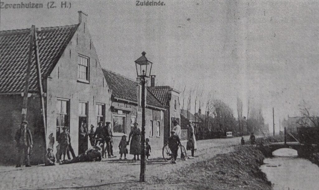 Op deze prentbriefkaart is het zuidelijk deel van de Dorpsstraat, toen aangeduid als het Zuideinde, afgebeeld. In het huis links op de foto was de schilderszaak van Verhoef met daarnaast de woning van de familie Hagendijk. Later kwam op de plaats van de schilderszaak het bekende hotel-café Vos. Wat verder naar achteren, ter hoogte van de achterste bomenrij, is aan de linkerkant de Kezenbuurt te zien. Deze buurt kreeg zijn naam vanwege het grote aantal bewoners met de voornaam Kees dat hier woonde. Tegenover deze buurt is de pinakel op een dak van het huis van de familie Bontenbal zichtbaar. Het betekent dat de foto in of na 1914 gemaakt is.